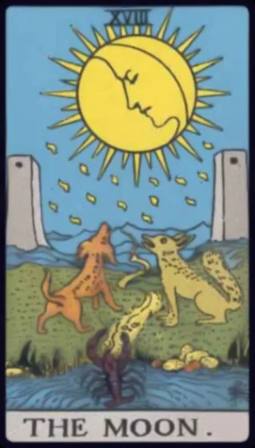 Der Mond zeigt eine nächtliche Landschaft, über der ein Krebs aus dem Wasser steigt – ein uraltes Tier, das für die tief verankerten Erfahrungen der Menschheit steht, für das, was in uns wirkt, lange bevor wir es bewusst benennen können.